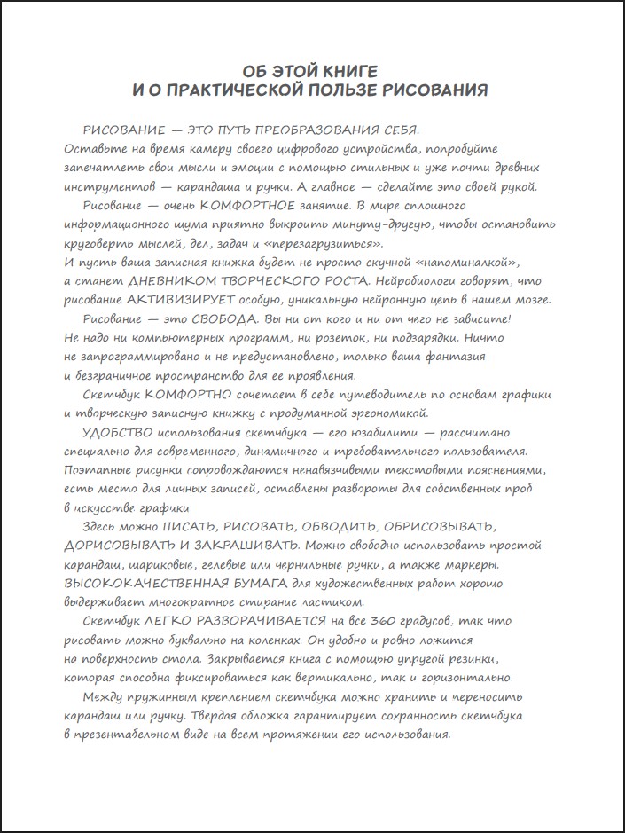 Скетчбук рассчитан на любой уровень подготовки. Поэтапные рисунки сопровождаются ненавязчивыми текстовыми пояснениями, есть место для личных записей, оставлены развороты для собственных проб в искусстве графики. Здесь можно писать, рисовать,обводить, обрисовывать, дорисовывать и закрашивать.