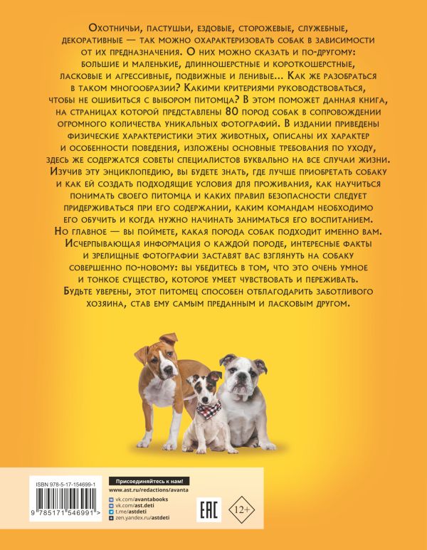 Какую собаку выбрать из огромного количества существующих пород? Как ей помочь устроиться на новом месте и что следует приобрести, чтобы животное было ухоженным, здоровым и счастливым? Какие признаки в поведении собаки указывают на то, что с ней не все в порядке? Какие правила необходимо выполнять, чтобы добиться взаимопонимания со своим питомцем, и что делать, если этого не случилось? Какие основные команды должна знать собака и когда можно приступать к ее обучению? Подробное описание каждой породы и советы специалистов, которые вы найдете на страницах этой энциклопедии, помогут вам разобраться со всеми возникающими вопросами. А чтобы вы научились лучше понимать собачьи повадки, в книге, помимо физических характеристик той или иной собаки, рассказа о ее поведении и предпочтениях, представлены интересные факты и множество уникальных фотографий. Все это поможет не ошибиться с выбором питомца, подходящего именно вам. Для среднего и старшего школьного возраста.