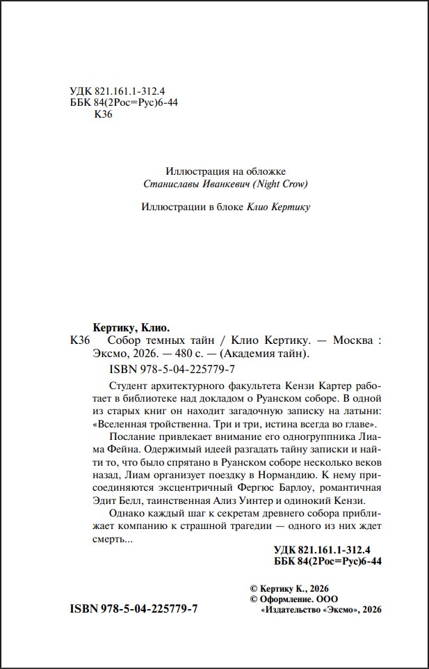Оставить отзывСтудент архитектурного факультета Кензи Картер работает в библиотеке над докладом о Руанском соборе. В одной из старых книг он находит загадочную записку на латыни: «Вселенная тройственна. Три и три, истина всегда во главе».