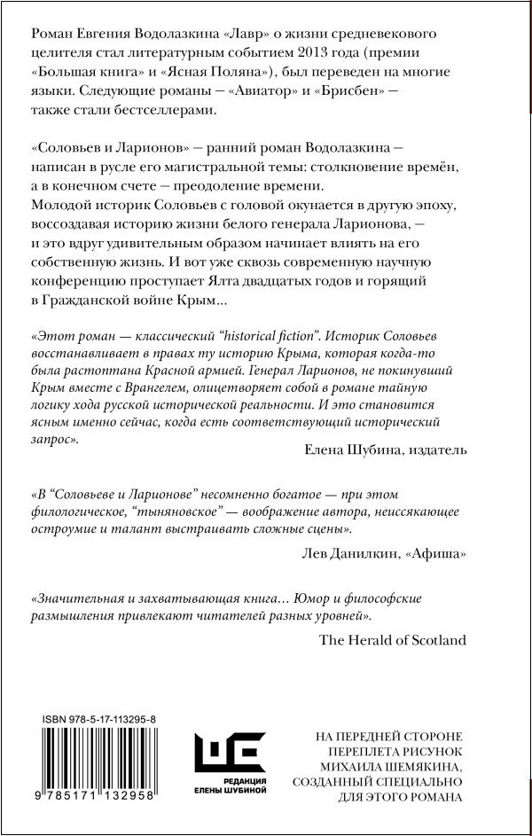 Роман Евгения Водолазкина «Лавр» о жизни средневекового целителя стал литературным событием 2013 года (премии «Большая книга» и «Ясная Поляна»), был переведен на многие языки. Следующие романы – «Авиатор» и «Брисбен» – также стали бестселлерами. «Соловьев и Ларионов»...