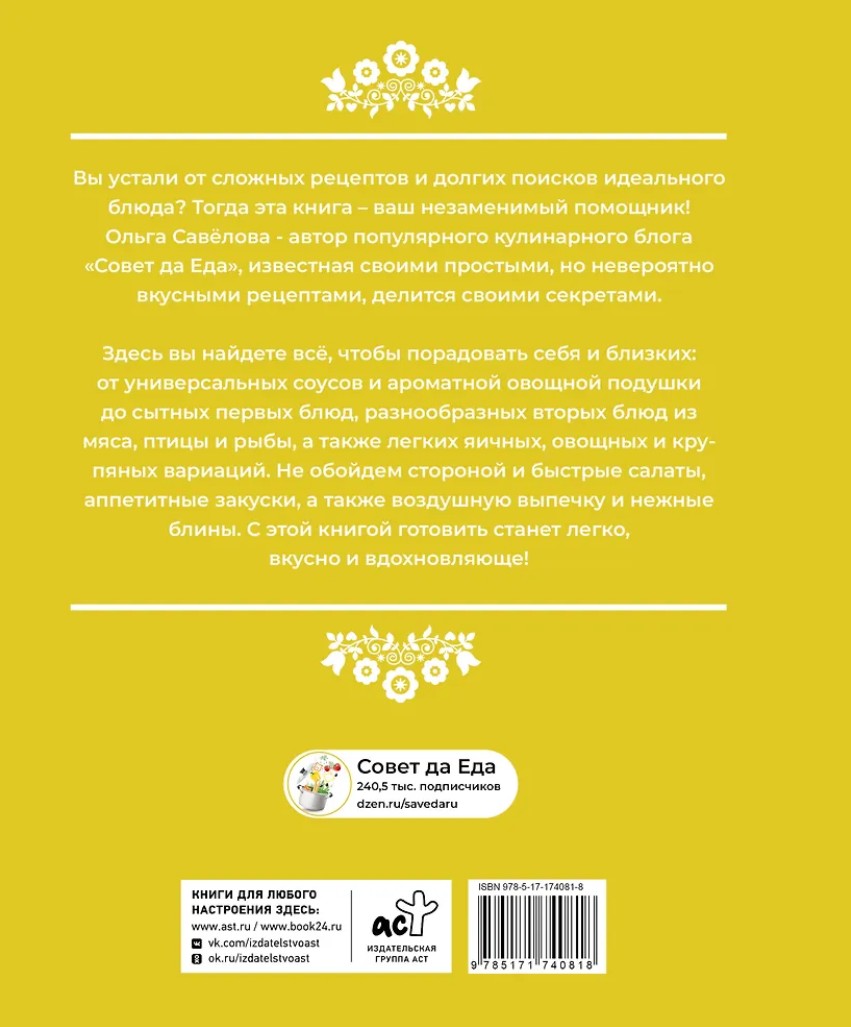 Оставить отзывВы устали от сложных рецептов и долгих поисков идеального блюда? Тогда эта книга – ваш незаменимый помощник! Ольга Савелова – автор популярного кулинарного блога «Совет да еда», известная своими простыми, но невероятно вкусными рецептами, делится своими секретами.