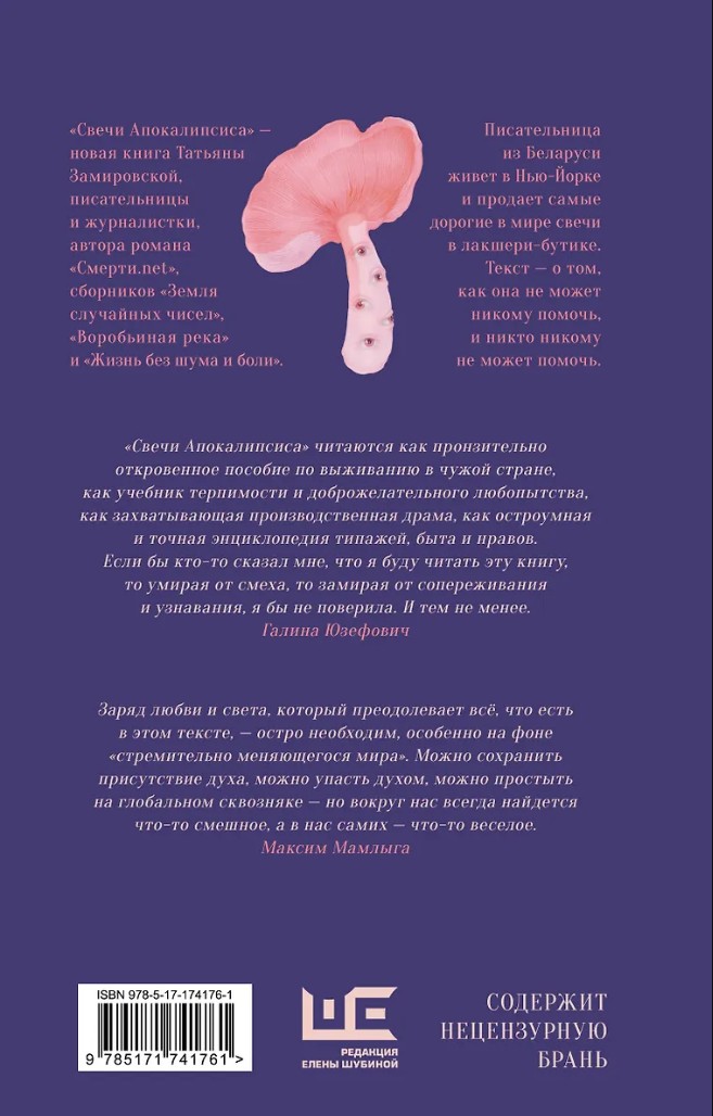 «Свечи Апокалипсиса» – новая книга Татьяны Замировской, писательницы и журналистки, автора романа «Смерти.net», сборников «Земля случайных чисел», «Воробьиная река» и «Жизнь без шума и боли».