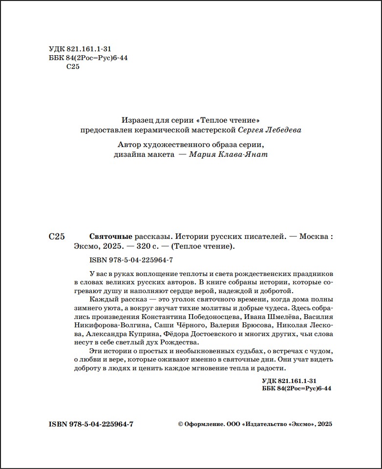 Каждый рассказ – это уголок святочного времени, когда дома полны зимнего уюта, а вокруг звучат тихие молитвы и добрые чудеса. Здесь собрались произведения Константина Победоносцева, Ивана Шмелёва, Василия Никифорова-Волгина, Саши Чёрного, Валерия Брюсова, Николая Лескова, Александра Куприна, Фёдора Достоевского и многих других, чьи слова несут в себе светлый дух Рождества.