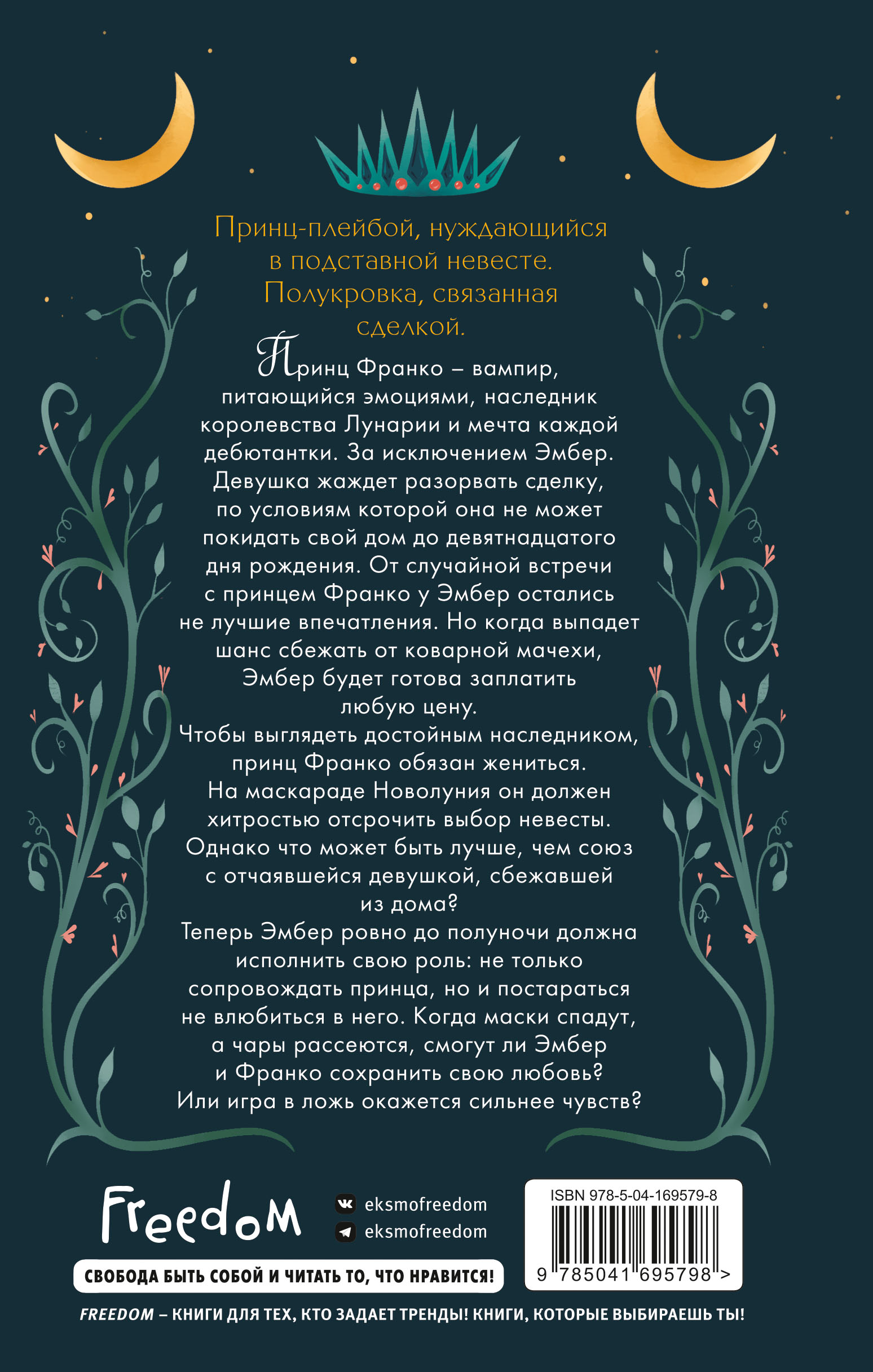 Принц Франко – вампир, питающийся эмоциями, наследник королевства Лунарии и мечта каждой дебютантки. За исключением Эмбер. Девушка жаждет разорвать сделку, по условиям которой она не может покидать свой дом до девятнадцатого дня рождения. От случайной встречи с принцем Франко у Эмбер остались не лучшие впечатления. Но когда выпадет шанс сбежать от коварной мачехи, Эмбер будет готова заплатить любую цену. Чтобы выглядеть достойным наследником, принц Франко обязан жениться. На маскараде Новолуния он должен хитростью отсрочить выбор невесты. Однако, что может быть лучше, чем союз с отчаявшейся девушкой, сбежавшей из дома? Теперь Эмбер ровно до полуночи должна исполнить свою роль: не только сопровождать принца, но и постараться не влюбиться в него. Когда маски спадут, а чары рассеются, смогут Эмбер и Франко сохранить свою любовь? Или игра в ложь окажется сильнее чувств?