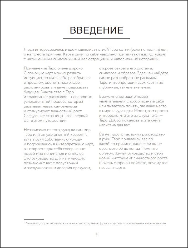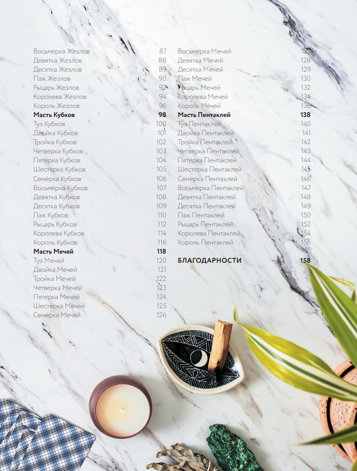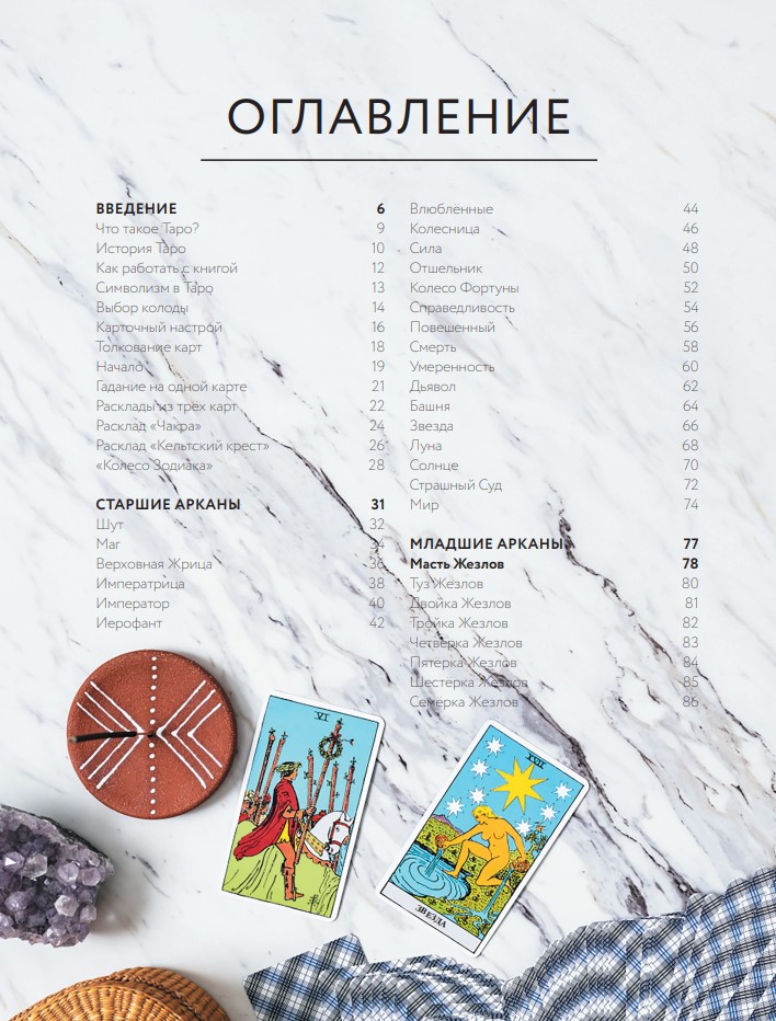 В ней есть все, чтобы быстро познакомиться с колодой и приступить к практике: описание структуры колоды Таро и правил работы с картами, толкования всех Старших и Младших арканов в прямом и перевернутом положении, расшифровка основных символов знаменитого Таро Уэйта и тематические значения карт для вопросов о любви, работе и своей личности.
