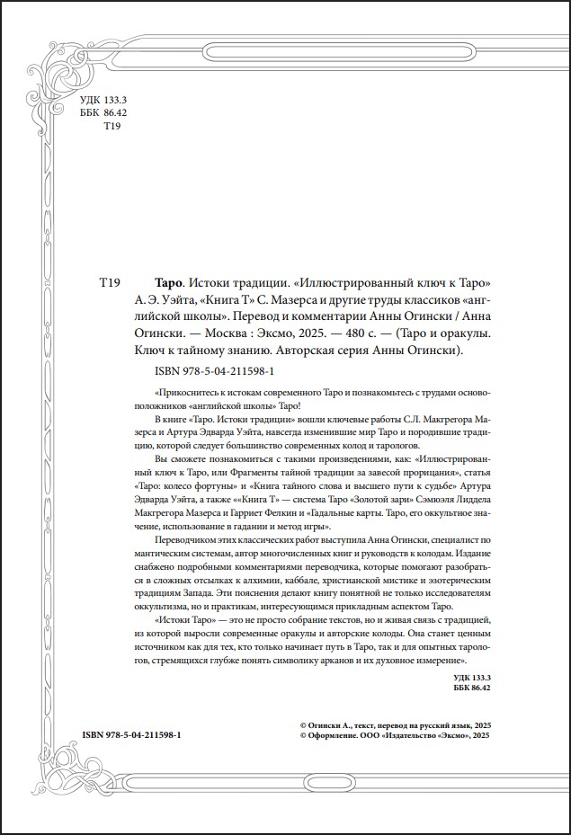 «Истоки Таро» – это не просто собрание текстов, но и живая связь с традицией, из которой выросли современные оракулы и авторские колоды. Она станет ценным источником как для тех, кто только начинает путь в Таро, так и для опытных тарологов, стремящихся глубже понять символику арканов и их духовное измерение.