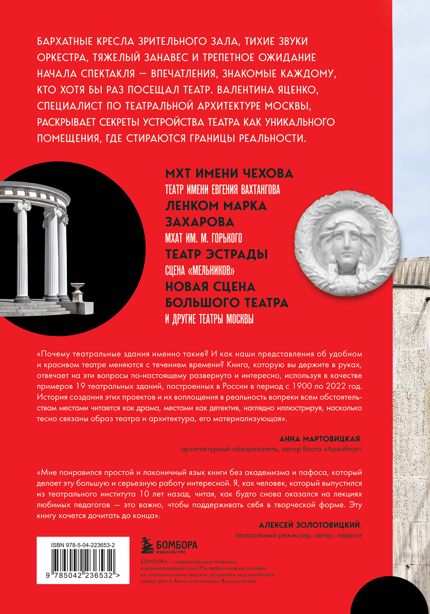 Эта книга – о театрах и о Москве, о том, как самый социальный вид искусства живет на столичных сценах. Валентина Яценко, редактор, долгое время сотрудничающая с театрами Москвы, рассказывает о том, как здание театра с его фасадами, колоннами, фальш-окнами, ложами, лепниной или аскетичной кирпичной кладкой, не просто служит фоном для игры актеров, но вступает в активный диалог с каждым, кто переступает его порог.
