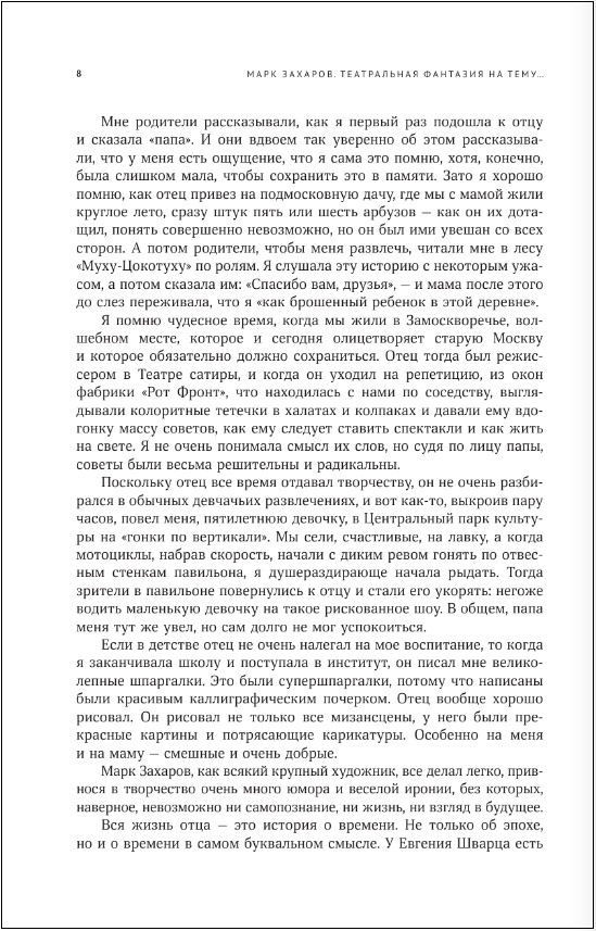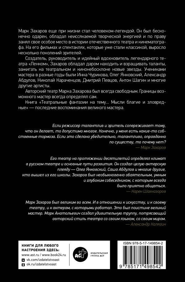 Создатель, руководитель и идейный вдохновитель легендарного театра «Ленком», Захаров обладал даром находить и взращивать таланты, зажигать на театральном и кино небосклоне новые звезды. Учениками мастера в разные годы были Инна Чурикова, Олег Янковский, Александр Абдулов, Николай Караченцов, Дмитрий Певцов, Антон Шагин и многие другие артисты. Авторский театр Марка Захарова был всегда свободным. Границы возможного мастер всегда определял сам. Книга «Театральные фантазии на тему... Мысли благие и зловредные» – последние воспоминания великого мастера.