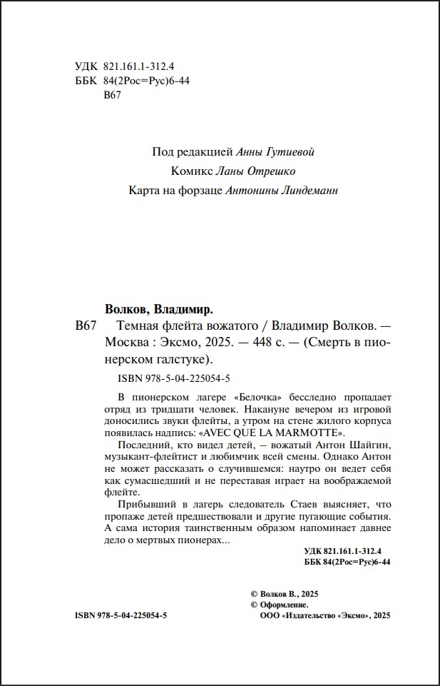 Оставить отзывВ пионерском лагере «Белочка» бесследно пропадает отряд из тридцати человек. Накануне вечером из игровой доносились звуки флейты, а утром на стене жилого корпуса появилась надпись: «AVEC QUE LA MARMOTTE».