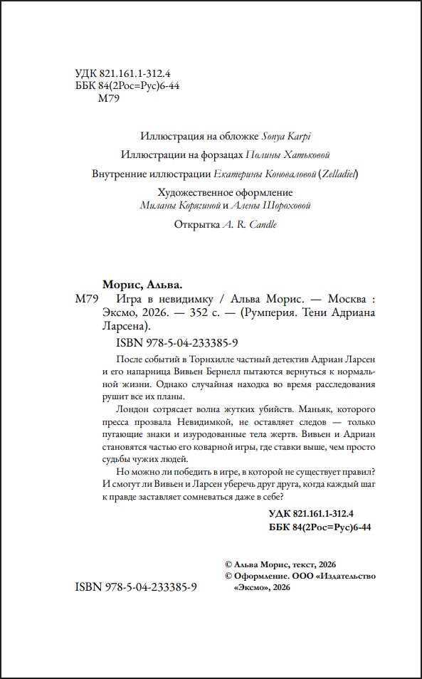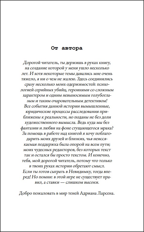 Новое опасное детективное расследование и страстная история любви в одном флаконе от автора «Призрак поместья Торнхилл»! Для любителей детективов с харизматичным маньяком, игр в «кошки-мышки» со смертью и героев, страсть которых воспламеняет! Погрузитесь в тайны убийцы Невидимки вместе с детективом Адрианом Ларсеном и его напарницей Вивьен Бернелл!