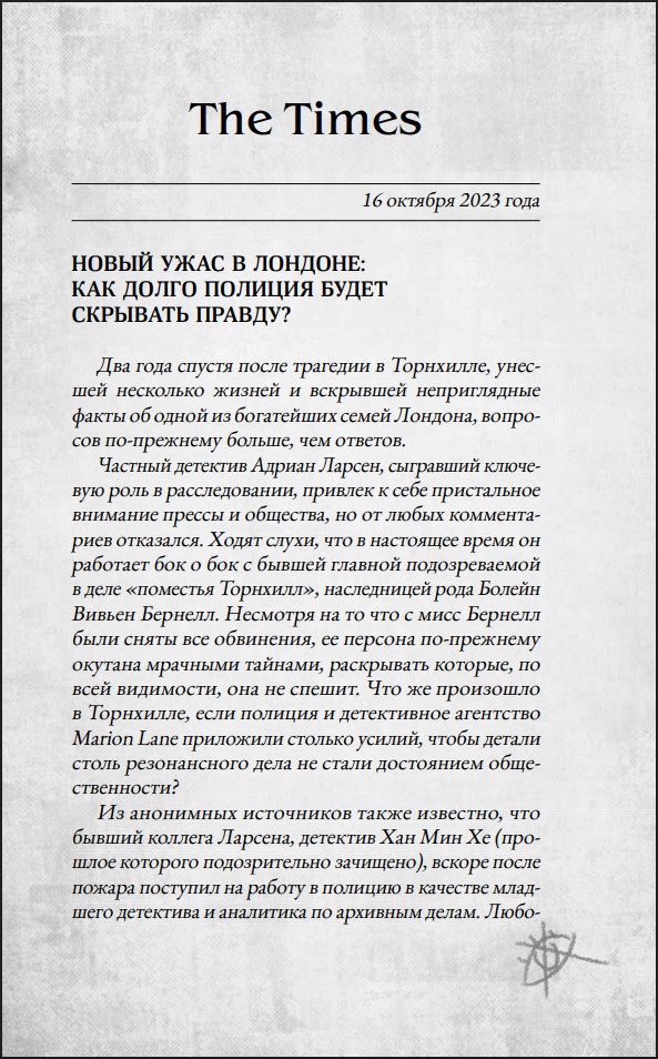 Новое опасное детективное расследование и страстная история любви в одном флаконе от автора «Призрак поместья Торнхилл»! Для любителей детективов с харизматичным маньяком, игр в «кошки-мышки» со смертью и героев, страсть которых воспламеняет!...