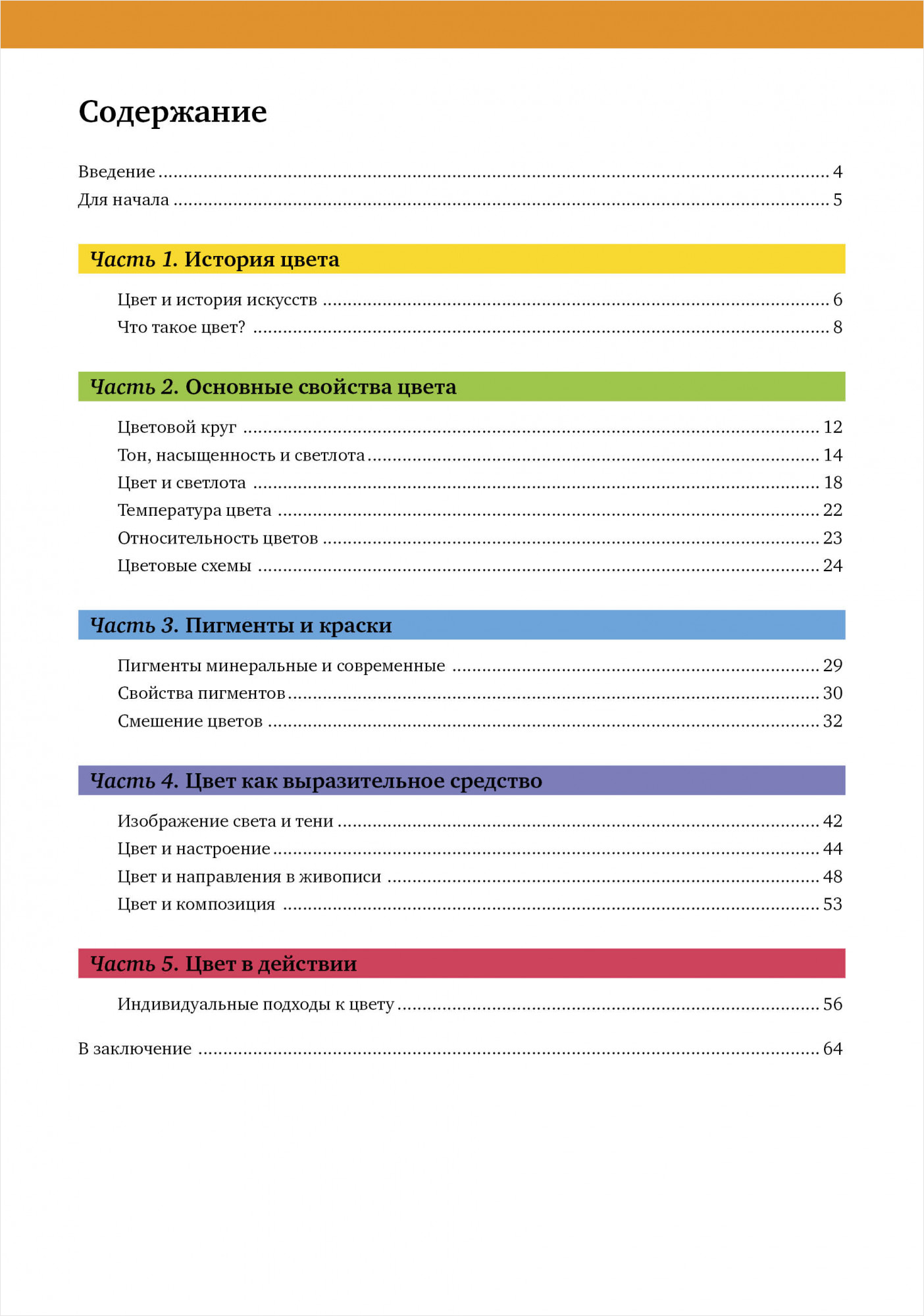 «Представить нашу жизнь без цвета невозможно, но что такое цвет? Как именно мы понимаем его, организуем и используем его силу так, чтобы он помогал нам в творчестве, общении и самовыражении? Я ставлю своей задачей познакомить читателя с концепциями теории цвета и подробно рассмотреть их, и в частности в приложении к живописи маслом и акрилом. Мы обсудим широкий круг полезных тем, которые, несомненно, позволят вам выйти на новый уровень понимания цвета — от свойств электромагнитного спектра до пигментов, цветовых схем и психологии цветовосприятия. Чем больше вы будете знать об организации и смешении цветов, тем лучше будете подготовлены к достижению ваших творческих целей. Давайте же погрузимся в мир цвета и изучим это поразительное явление!» (Патти Моллика)