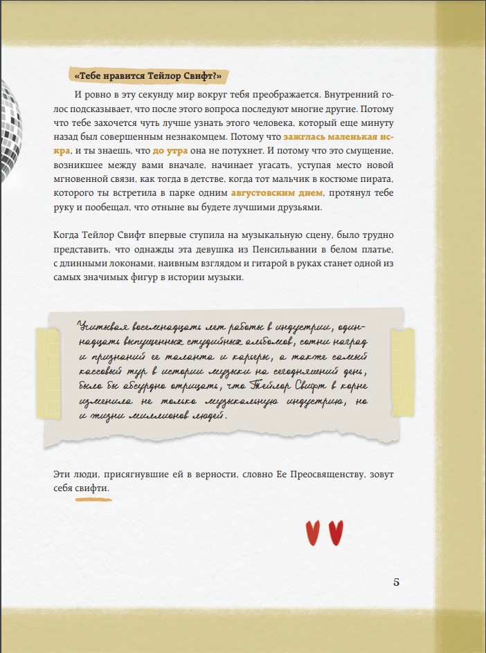 А еще это твоя и моя история: как мы влюблялись, как прятались в убежище, зализывая раны, как росли и обретали себя вместе с Тейлор Свифт.