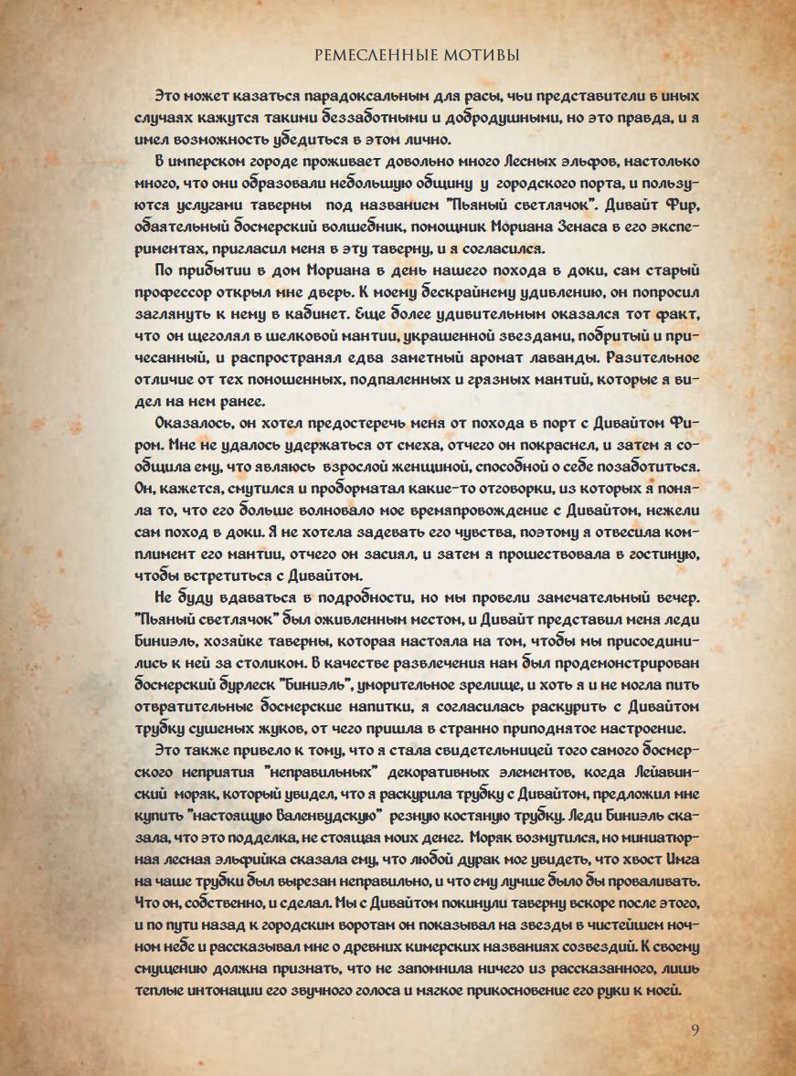 Книга станет прекрасным путеводителем по многонациональному миру Тамриэля и познакомит вас с эльфийскими ремеслами, оркскими верованиями, военным искусством Гильдии бойцов и, конечно же, могущественной даэдрической магией…