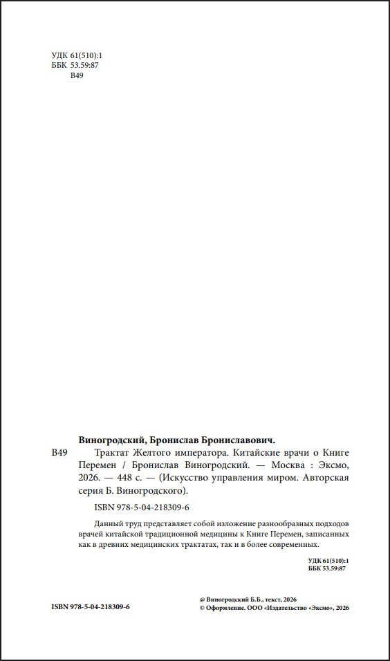 Новая книга Бронислава Виногродского посвящена китайской медицине. Данный труд представляет собой изложение разнообразных подходов традиционной медицины к Книге Перемен, записанных как в древних медицинских трактатах, так и в более современных.