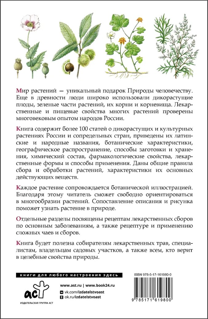 Книга содержит более 100 статей о дикорастущих и культурных растениях России и сопредельных стран, приведены их латинские и народные названия, ботанические характеристики, географическое распространение, способы заготовки и хранения, химический состав, фармакологические свойства, лекарственные формы и способы применения. Даны общие правила сбора и обработки растений, характеристики их основных действующих веществ.