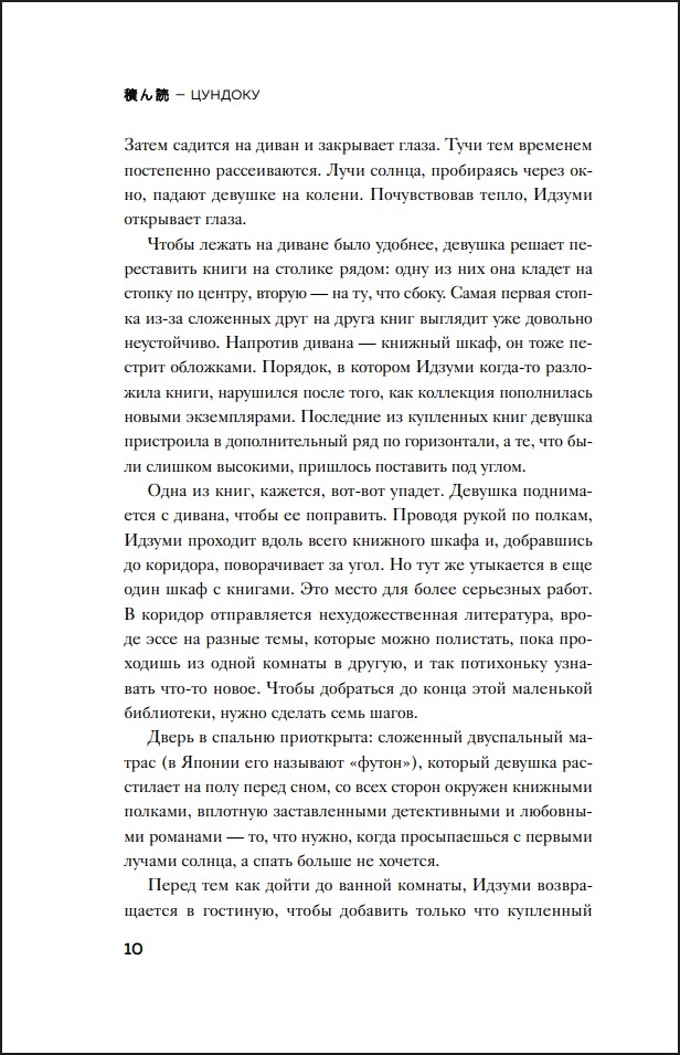 Японское слово «цундоку» состоит из двух иероглифов: «укладка» и «чтение». Жить среди непрочитанных книг и чувствовать себя при этом свободно – и есть тонкое искусство цундоку, освоить которое стоит каждому, кто частенько посещает книжные выставки и магазины.
