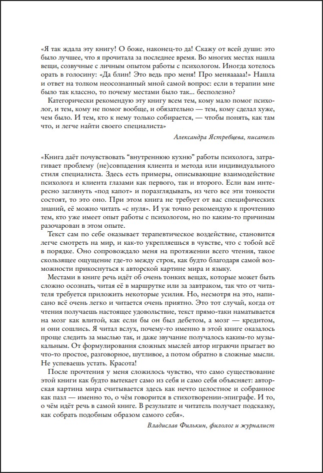 Эта книга для тех, кто запутался в терапевтических отношениях: клиентов, которые не чувствуют понимания и поддержки, и специалистов, у которых не складывается контакт с «трудным» случаем.