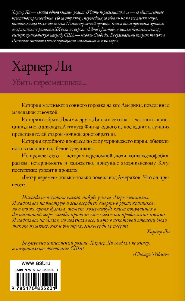 Оставить отзывИстория маленького сонного городка на юге Америки, поведанная маленькой девочкой. История ее брата Джима, друга Дилла и ее отца – честного, принципиального адвоката Аттикуса Финча, одного из последних и лучших представителей старой «южной аристократии».