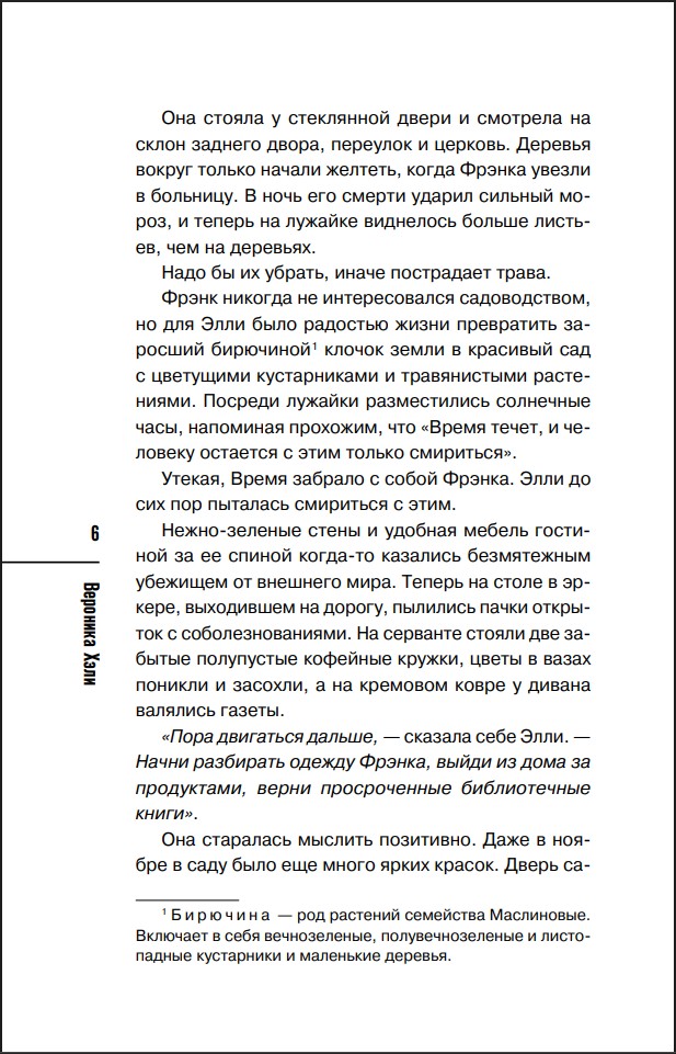 Полиция и мать погибшего убеждены, что в ночь убийства Элли видела гораздо больше, чем говорит. Но бедная женщина никак не может понять, к чему они клонят. Отбиваясь от чересчур назойливого внимания пастора, любящего заботиться о новоиспеченных вдовах, она решает защитить от детективов свою соседку, которую сделали главной подозреваемой, и выяснить правду.
