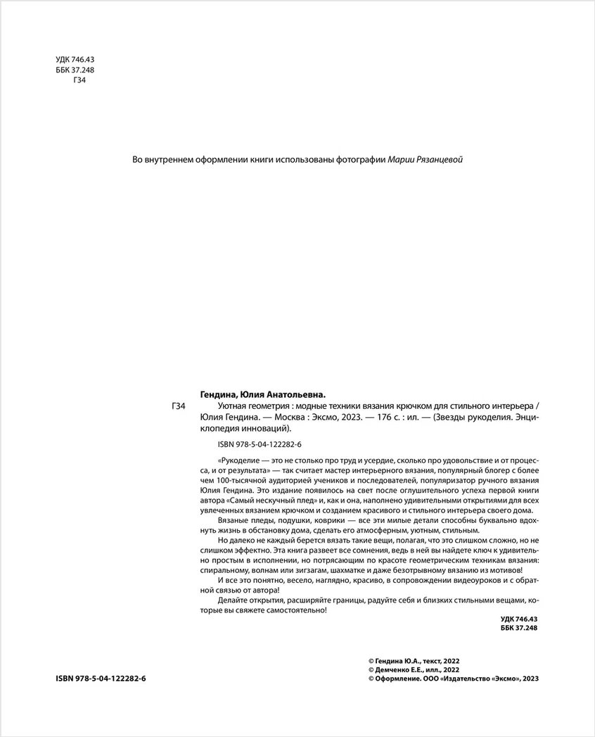 «Рукоделие – это не столько про труд и усердие, сколько про удовольствие и от процесса, и от результата» – так считает мастер интерьерного вязания, популярный блогер с более чем 100-тысячной аудиторией учеников и последователей, популяризатор ручного вязания Юлия Гендина. Это издание появилось на свет после оглушительного успеха первой книги автора «Самый нескучный плед», и, как и она, наполнено удивительными открытиями для всех увлеченных вязанием крючком и созданием красивого и стильного интереьера своего дома.