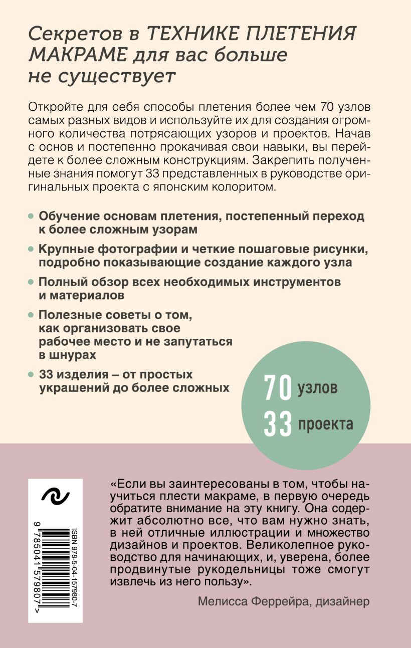 Оставить отзывУникальный справочник по японской технологии плетения узлов и узоров макраме в серии книг, предназначенных для повышения уровня мастерства! В нашей повседневной жизни мы постоянно плетем узлы, абсолютно об этом не задумываясь, делая это автоматически. Но что, если посмотреть на это действие не только с практической, но и с эстетической стороны? Ведь стоит только переплести одну нить с другой и затянуть в узел – это и будет основа макраме. Техника макраме – безграничное поле для творческой реализации. При этом вам не потребуется практически ничего кроме мотка шнура и, ну разве что, нескольких простых инструментов.