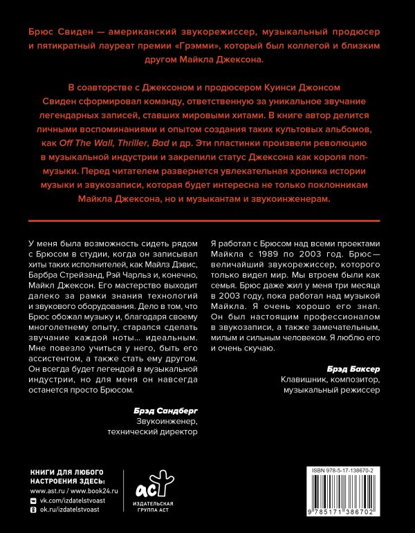 Оставить отзывКнига «В студии с Майклом Джексоном» рассказывает о работе Брюса Свидена – американского звукоинженера, музыкального продюсера и пятикратного лауреата премии «Грэмми», который был близким другом и коллегой Майкла Джексона.