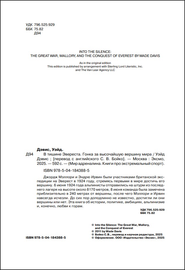 Автор множества бестселлеров, Уэйд Дэвис, опираясь на более чем десятилетние исследования, живо воссоздает героические усилия Мэллори и его товарищей, учитывая их значительные достижения, в широкий исторический контекст: от имперских амбиций Британии XIX века до войны, которая сформировала поколение Мэллори.