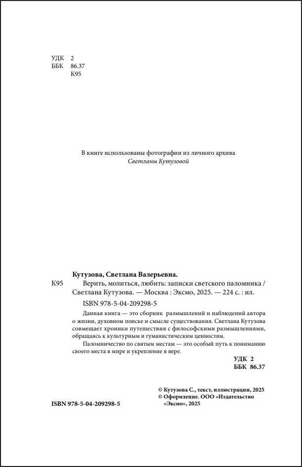 Данная книга – это сборник размышлений и наблюдений автора о жизни, духовном поиске и смысле существования. Светлана Кутузова совмещает хроники путешествия с философскими размышлениями, обращаясь к культурным и гуманистическим ценностям. Паломничество по святым местам – это особый путь к пониманию своего места в мире и укрепление в вере.