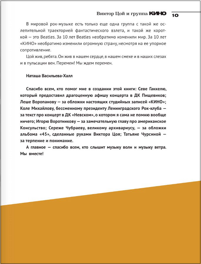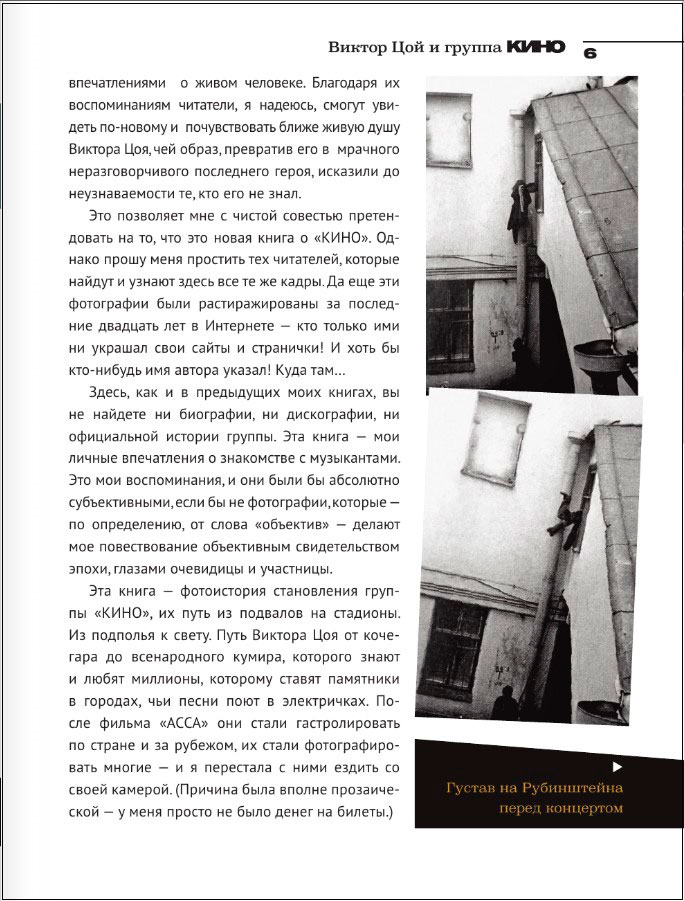 «Здесь, как и в предыдущих моих книгах, вы не найдете ни биографии, ни дискографии, ни официальной истории группы. Эта книга – мои личные впечатления о знакомстве с музыкантами. Это мои воспоминания, и они были бы абсолютно субъективными, если бы не фотографии, которые – по определению, от слова «объектив» – делают мое повествование объективным свидетельством эпохи, глазами очевидицы и участницы».