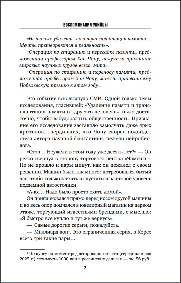 Это событие всколыхнуло СМИ. Профессор Сеульского национального университета Хан Чону разработал методику стирания воспоминаний и их пересадки от одного человека к другому. Он стал знаменитостью в научных кругах. Однако вскоре произошло то, что перевернуло его жизнь еще раз…