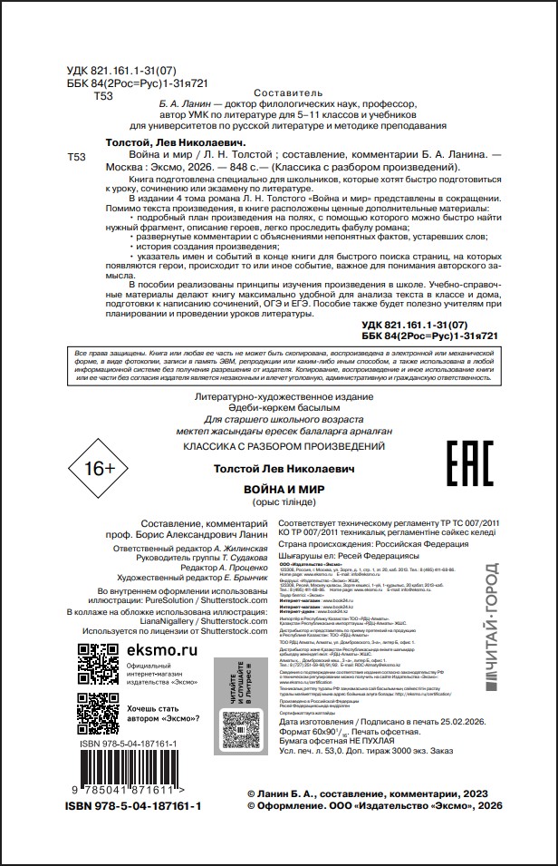 Все 4 тома грандиозной эпопеи приводятся в лаконичном сокращении, не упуская при этом ничего важного. Новое издание романа в невероятном оформлении с голографической фольгой на обложке станет не только незаменимым помощником в подготовке к ЕГЭ, ОГЭ, урокам литературы, но и приятным подарком для всех ценителей классической литературы.