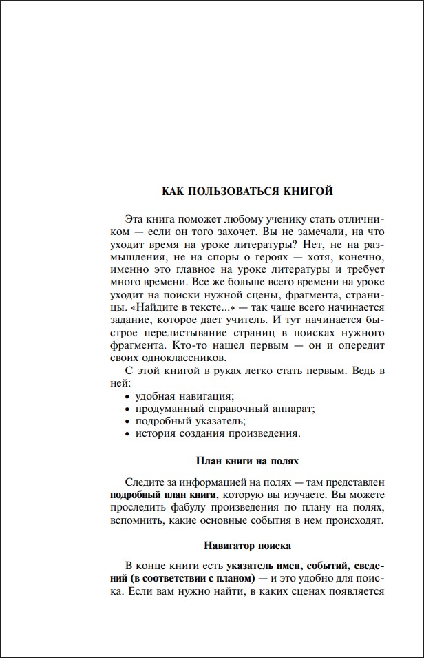 В нем вы найдете уникальные справочные материалы: заметки на полях для быстрого поиска нужного фрагмента, развернутые комментарии, где объясняются устаревшие слова и непонятные факты, историю создания произведения, указатель имен и событий. Все это поможет не только быстро и легко подготовиться к экзаменам, но и узнать новые факты, которые можно было упустить на уроке.