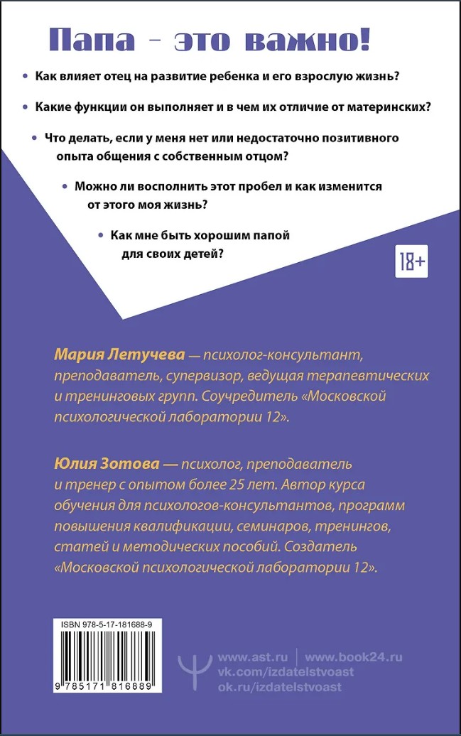 Ответам на эти вопросы посвящена книга психологов Юлии Зотовой и Марии Летучевой. Это третье издание бестселлера «Все дело в папе». По сравнению с первым изданием авторы расширили содержание подробным описанием отцовских функций, а также переработали раздел о влиянии отца на мужские сценарии. Появилась глава с примерами позитивных сценариев в отношениях.