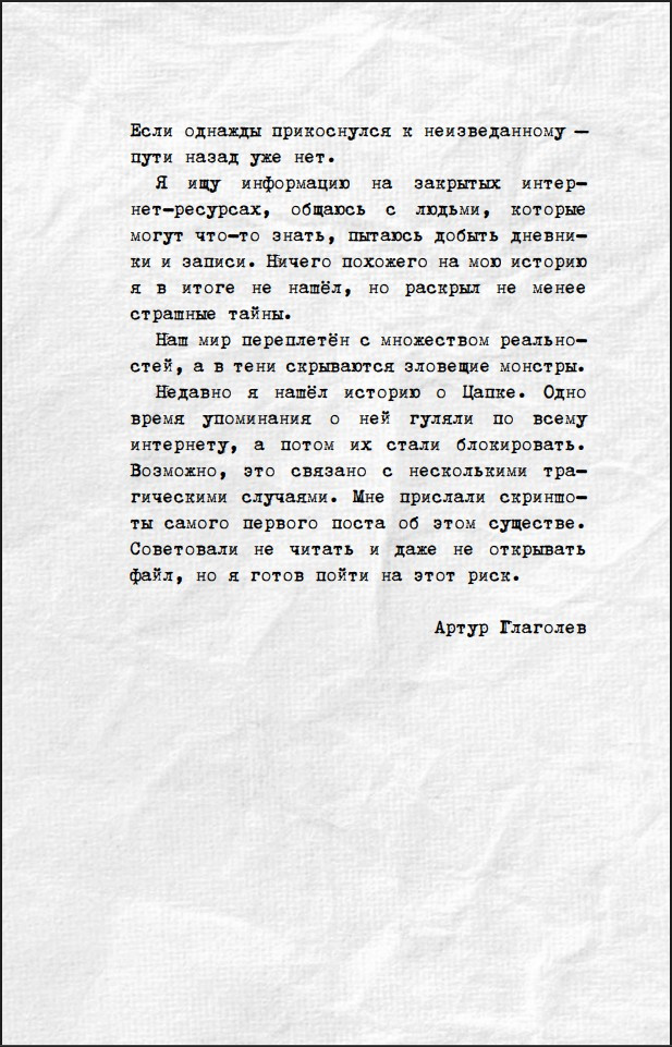 В кромешной тьме подъездов прячется существо с когтями-бритвами. По ночным улицам бродит пионер с головой плюшевого медведя. А на окраине города, есть бездонный провал – говорят, он тянется до самого ада.