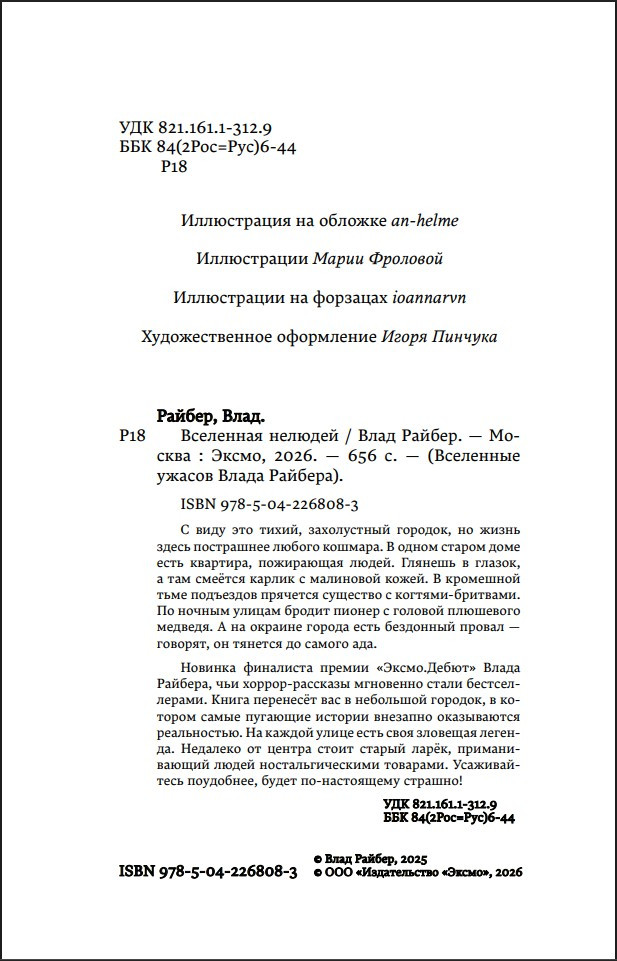 Новинка финалиста премии «Эксмо.Дебют» Влада Райбера, чьи хоррор-рассказы мгновенно стали бестселлерами. Книга перенесёт вас в небольшой городок, в котором самые пугающие истории внезапно оказываются реальностью.