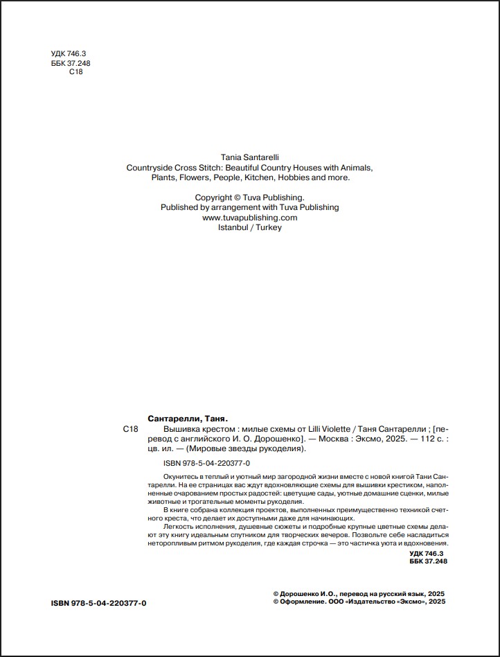 Окунитесь в теплый и уютный мир загородной жизни вместе с новой книгой Тани Сантарелли. На ее страницах вас ждут вдохновляющие схемы для вышивки крестиком, наполненные очарованием простых радостей: цветущие сады, уютные домашние сценки, милые животные и трогательные моменты рукоделия.