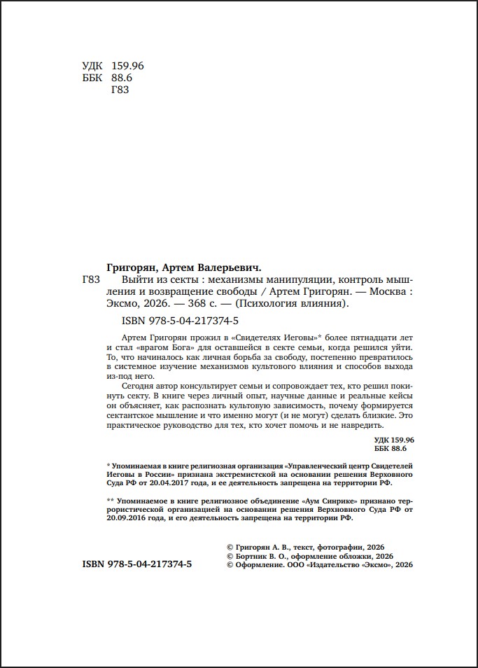 Артем Григорян прожил в «Свидетелях Иеговы»* более пятнадцати лет и стал «врагом Бога» для оставшейся в секте семьи, когда решился уйти. То, что начиналось как личная борьба за свободу, постепенно превратилось в системное изучение механизмов культового влияния и способов выхода из него.