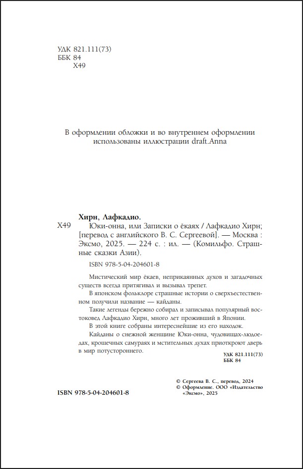 Оставить отзывТакие легенды бережно собирал и записывал популярный востоковед Лафкадио Хирн, много лет проживший в Японии. В этой книге собраны интереснейшие из его находок. Кайданы о снежной женщине Юки-онна, чудовищах-людоедах, крошечных самураях и мстительных духах приоткроют дверь в мир потустороннего.