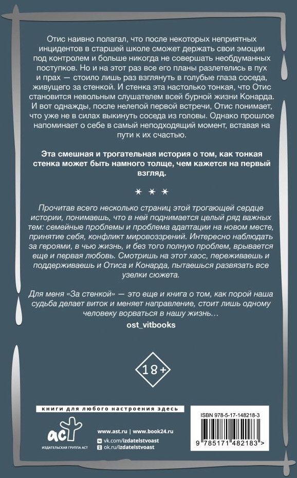 Отис наивно полагал, что после некоторых неприятных инцидентов в старшей школе сможет держать свои эмоции под контролем и больше никогда не совершать необдуманных поступков. Но и на этот раз все его планы разлетелись в пух и прах – стоило лишь раз взглянуть в голубые глаза соседа, живущего за стенкой. И стенка эта настолько тонкая, что Отис становится невольным слушателем всей бурной жизни Конарда. И вот однажды, после нелепой первой встречи, Отис понимает, что уже не в силах выкинуть соседа из головы. Однако прошлое напоминает о себе в самый неподходящий момент, вставая на пути к их счастью.