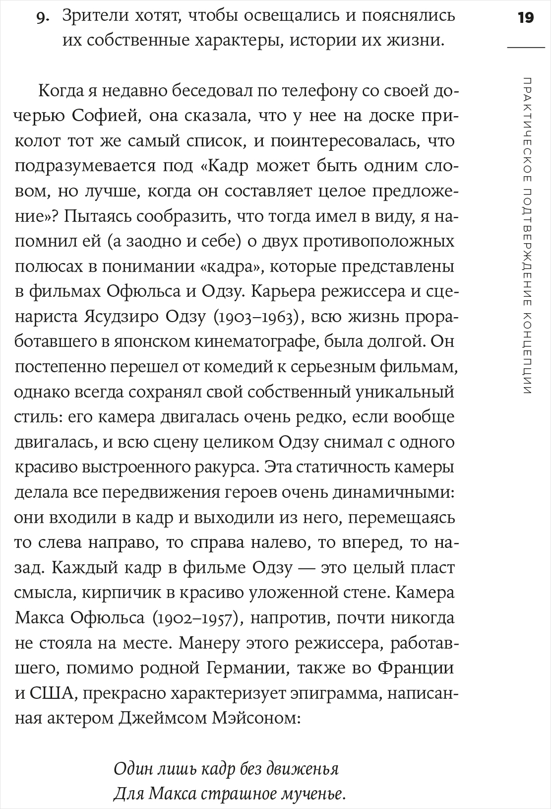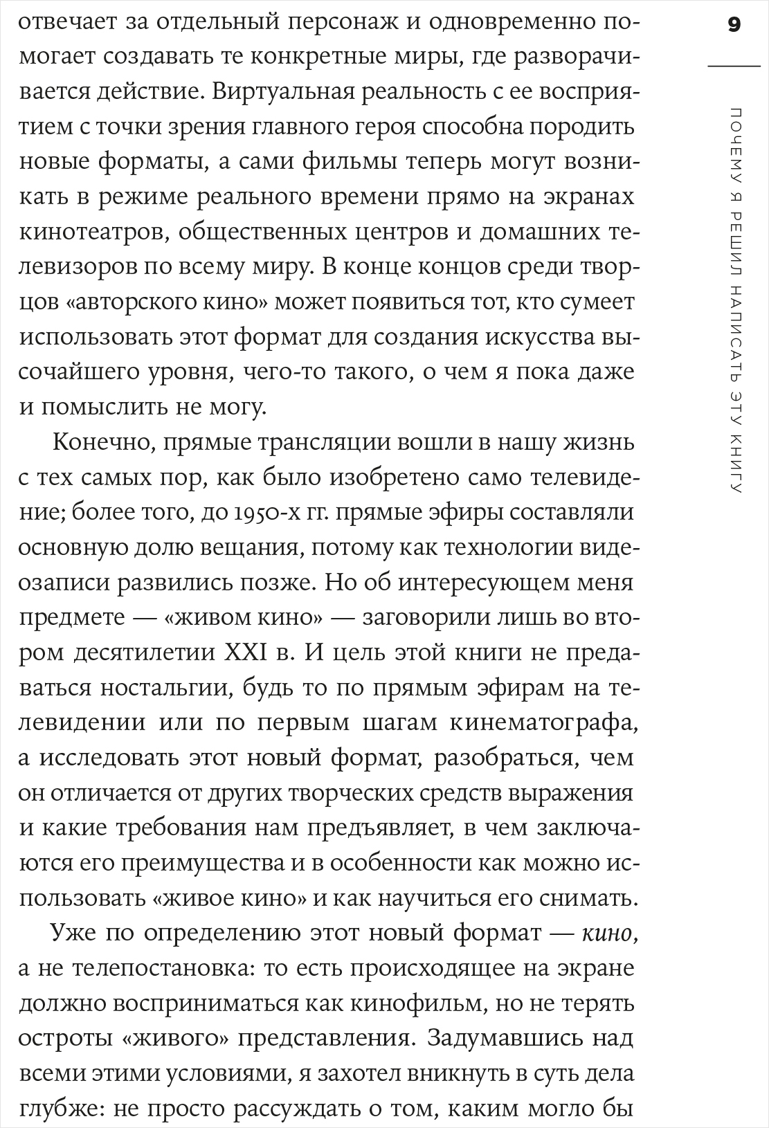 Такой фильм, снятый одним дублем, в режиме реального времени, с элементами сценической постановки и использованием новейших технологий, по уверению автора, даст режиссерам больше творческой свободы, а зрителям – ощущение, что они смотрят кино прямо в процессе его создания. В этой книге Коппола рассказывает о трудностях, с которыми столкнулся при подготовке и съемках «живого кино», размышляет об особенностях работы с актерами и построения кадра.