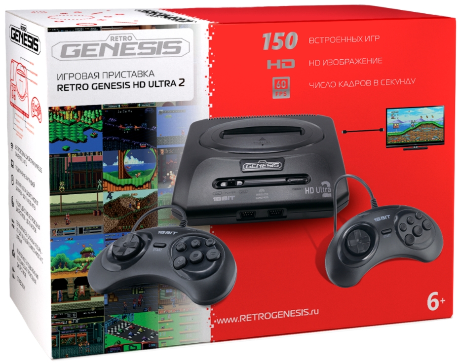 Особенности игровой приставки SEGA Retro Genesis HD Ultra 2 + 150 игр (2 проводных джойстика, HDMI кабель):