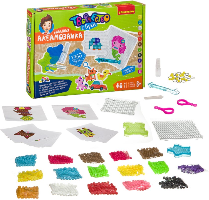Оставить отзывПопробуйте и оцените новый вид творчества – аквамозаика! Всё, что нужно сделать – выложить по трафарету желаемую фигурку персонажа, после слегка смочить водой детали, подождать… И поделка готова! В этом наборе как никогда много бусин, а значит, много простора для фантазии! Ведь фигурки можно выкладывать не только по разнообразным трафаретам из набора, но и попробовать создать что-то самому!