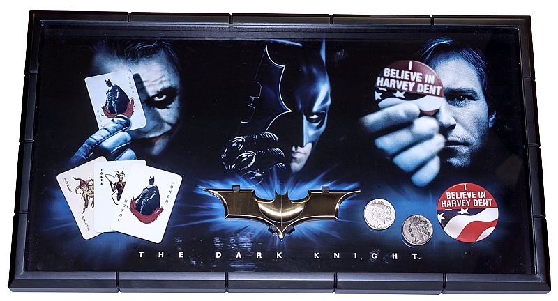 Набор реквизита из фильма Темный рыцарь включает в себя бэтаранг Бэтмена, карты Джокера, монеты и значок Харви Дента, помещенные в лаконичный выставочный бокс.