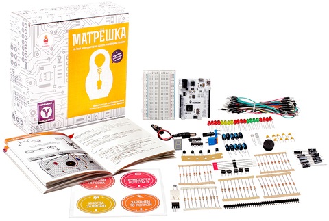 Оставить отзывЕсли вы хотите начать работать с Arduino, но у вас нет опыта и нет базовых радиодеталей и приспособлений, набор Матрёшка Y Iskra – это лучший выбор. В нём вы найдёте нашу версию популярной Arduino Leonardo, набор радиодеталей, провода, макетную плату, а главное – красочную лаконичную обучающую брошюру, которая с нуля научит вас делать собственные электронные устройства.