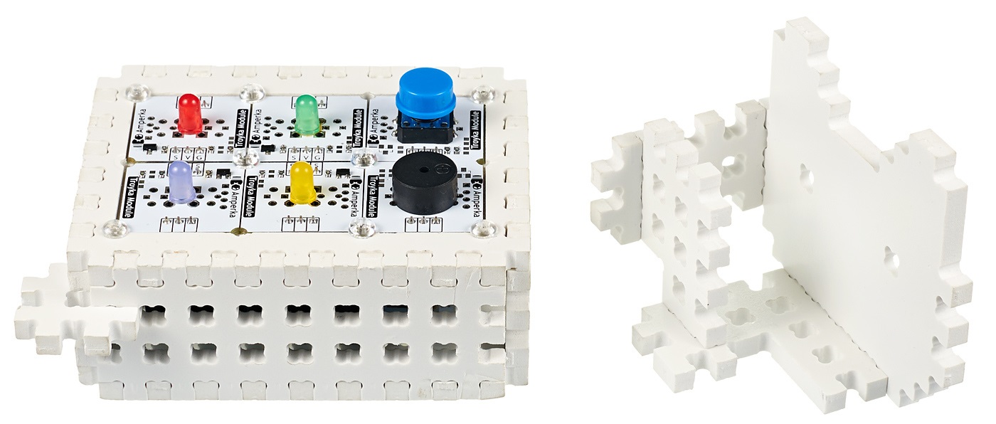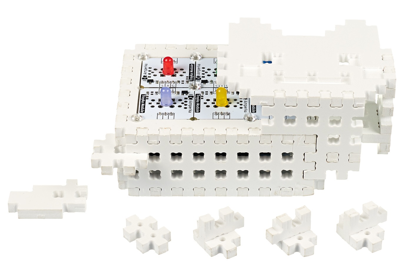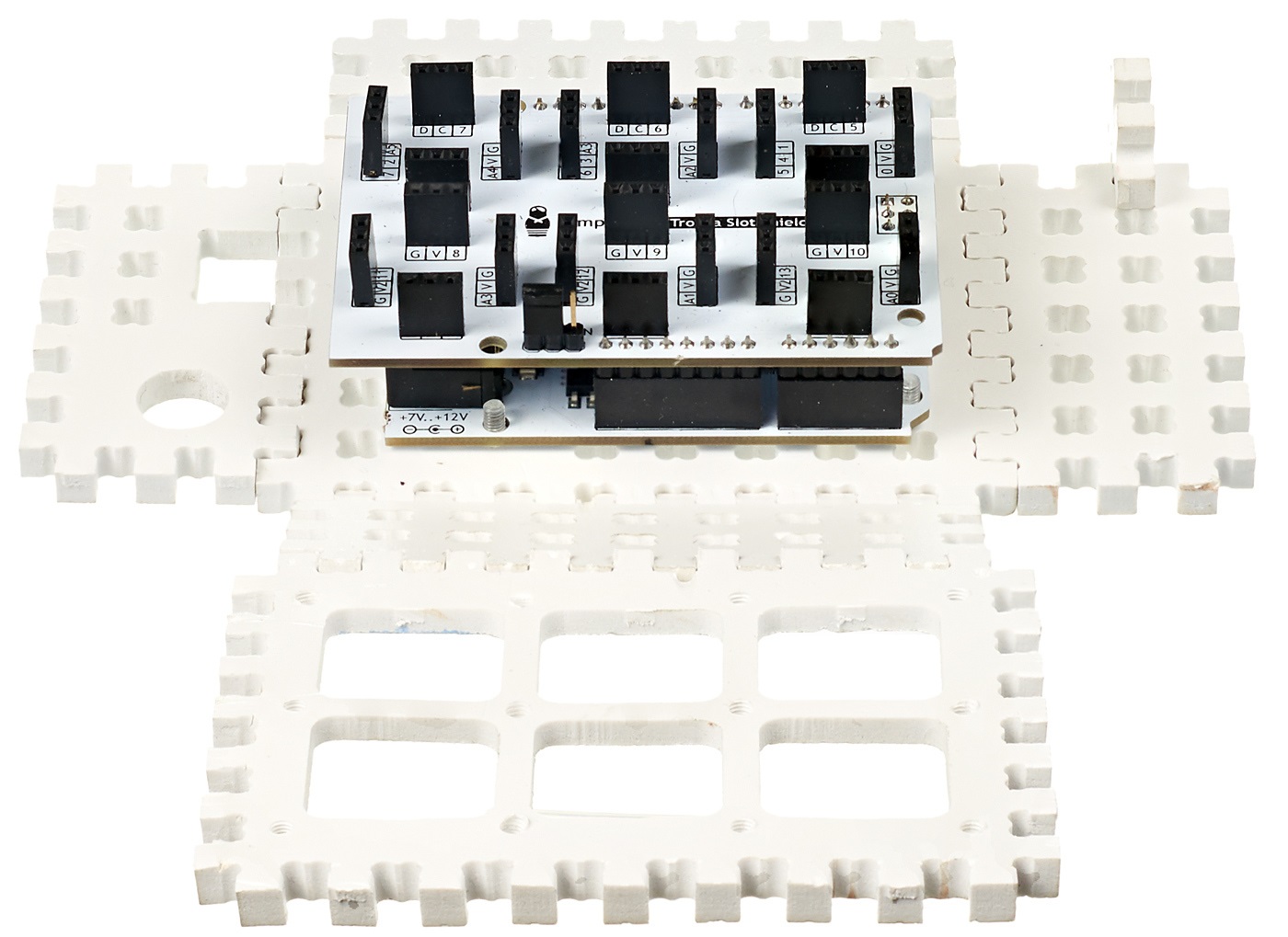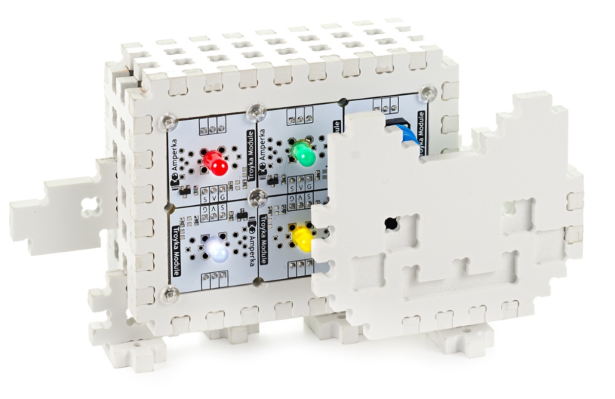 Электронные компоненты набора – четыре светодиода, кнопка и баззер – подключаются к контроллеру через Slot Shield. Даже провода не понадобятся – модули просто вставляются в разъёмы шилда. Ошиблись или собрали что-то не так – не беда: вытащите модуль и вставьте его по-новому. Ничего не испортится.