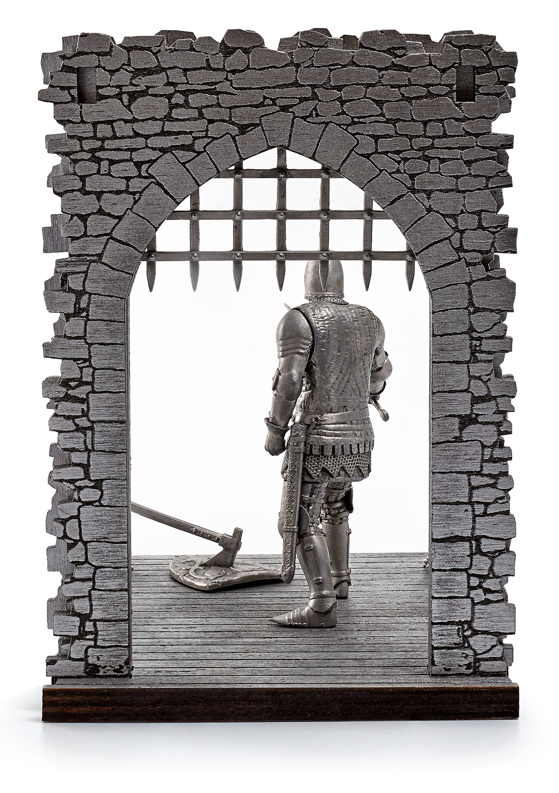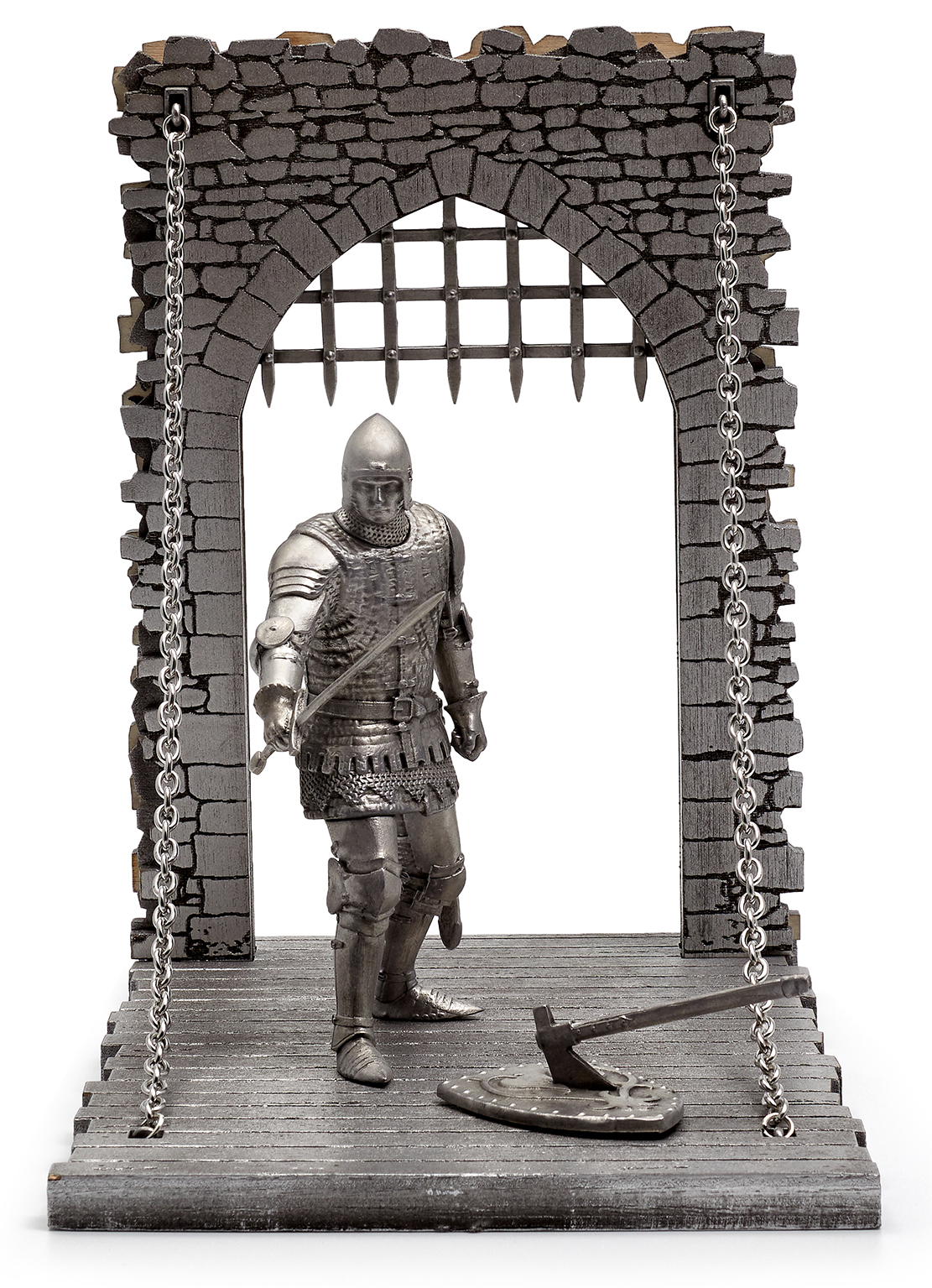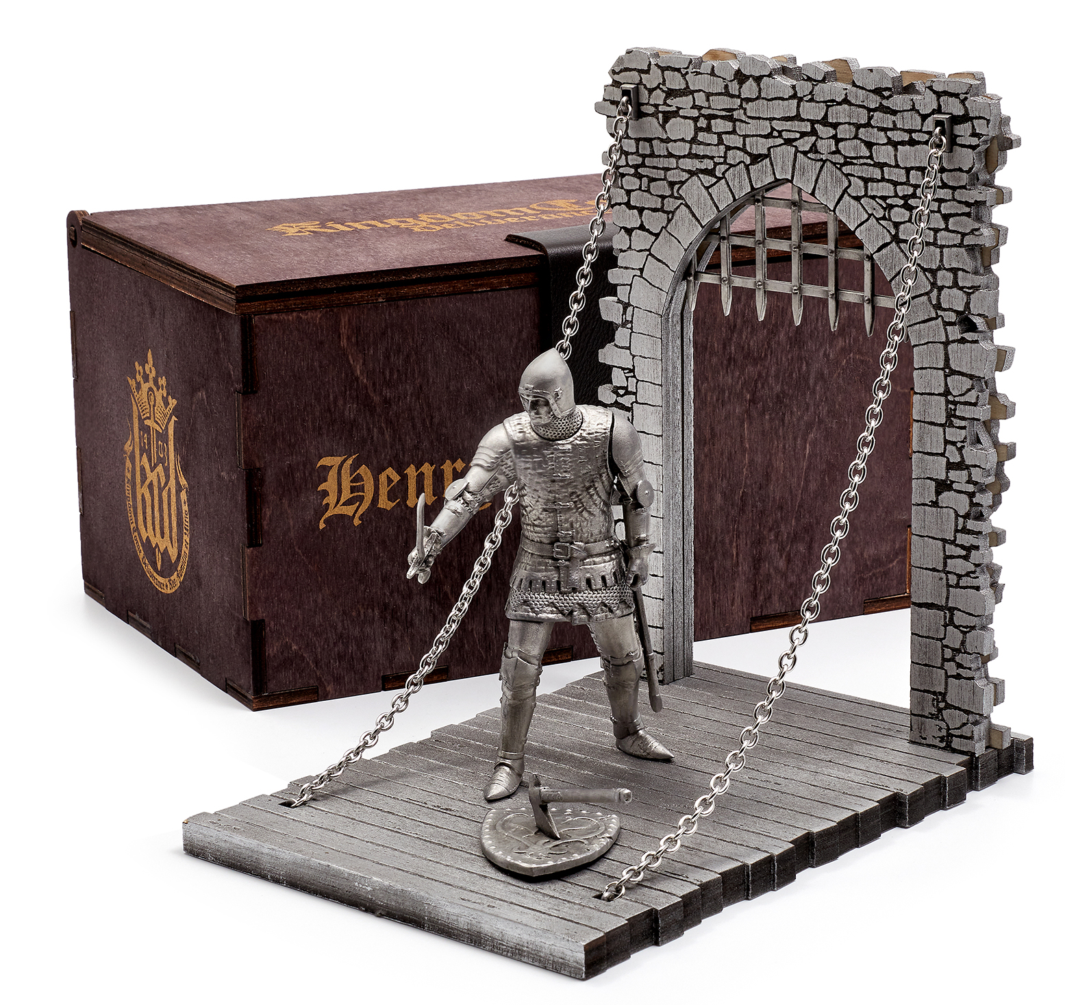 - Фигурка персонажа Индржиха в доспехах (в шлеме) на стилизованной подставке в виде откидного моста