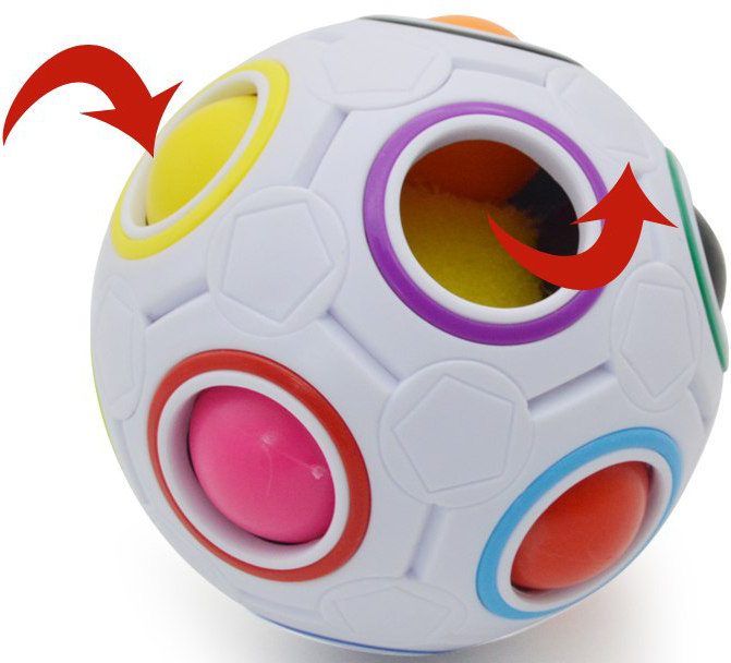 У этой круглой головоломки известной так же под названием ORBO на поверхности 12 отверстий, обозначенных разными цветами. 11 цветных шариков находятся внутри и выглядывают через отверстия. Одно отверстие остается свободным, для того чтобы можно было перемещать шарики с места на места. Процесс игры похож на классическую игру «Пятнашки», хотя конечно это более современный, интересный и красочный вариант.