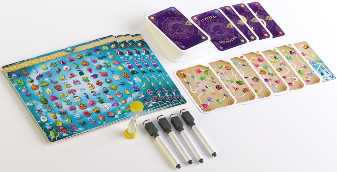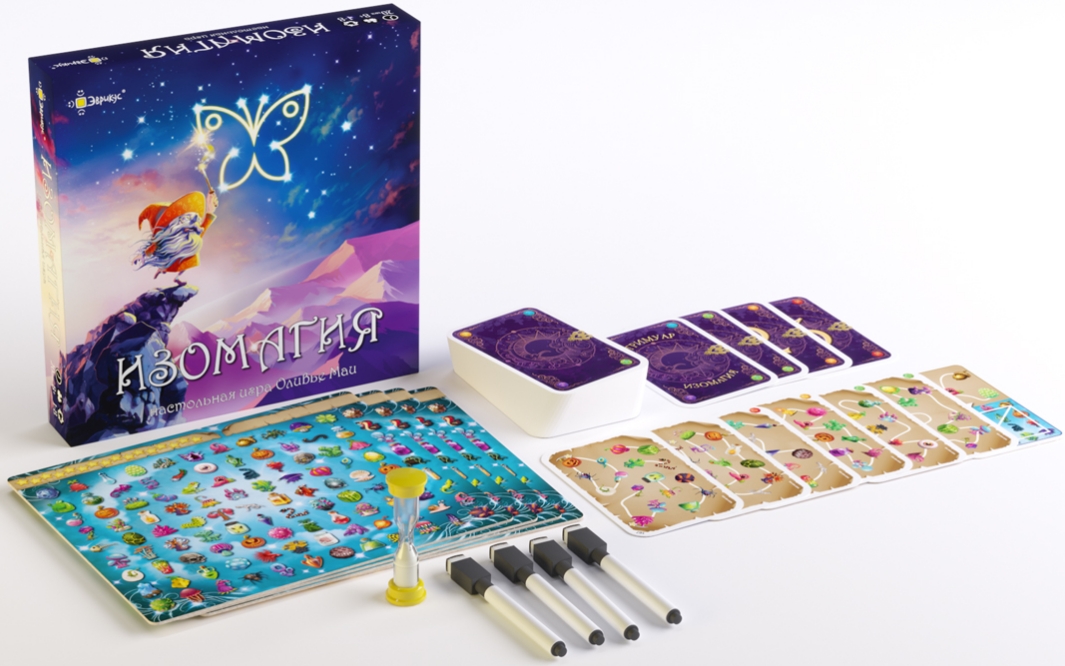 «Изомагия» – семейная настольная игра, которая одинаково хороша и для детей, и для взрослых. Перед игрой можно выбрать один из четырёх режимов игры: командный, где игроки разбиваются на команды по 2 человека и соревнуются между собой, соревновательный, где игроки соревнуются между собой, кооперативный, где всем игрокам нужно действовать сообща, и соло-режим для одного игрока, в котором итог партии зависит от количества использованных игроком линий. В ходе игры участники с помощью магического рисования расшифруют 8 различных заклинаний. Каждый раунд игроки, действуя одновременно, расшифровывают одно заклинание. Каждый игрок находит на своём игровом поле элементы, указанные на карточке заклинания, и соединяет их линией с помощью маркера. Задача – быстрее других узнать объект, который будет нарисован на игровом поле, и написать его название. Правильно назвав объект, нарисованный на игровом поле, игрок получит 1 или 2 звезды престижа. Ученик изомаг с наибольшим числом звёзд будет объявлен победителем и сможет продолжить обучение в самой престижной Академии изобразительного волшебства.