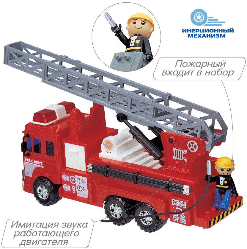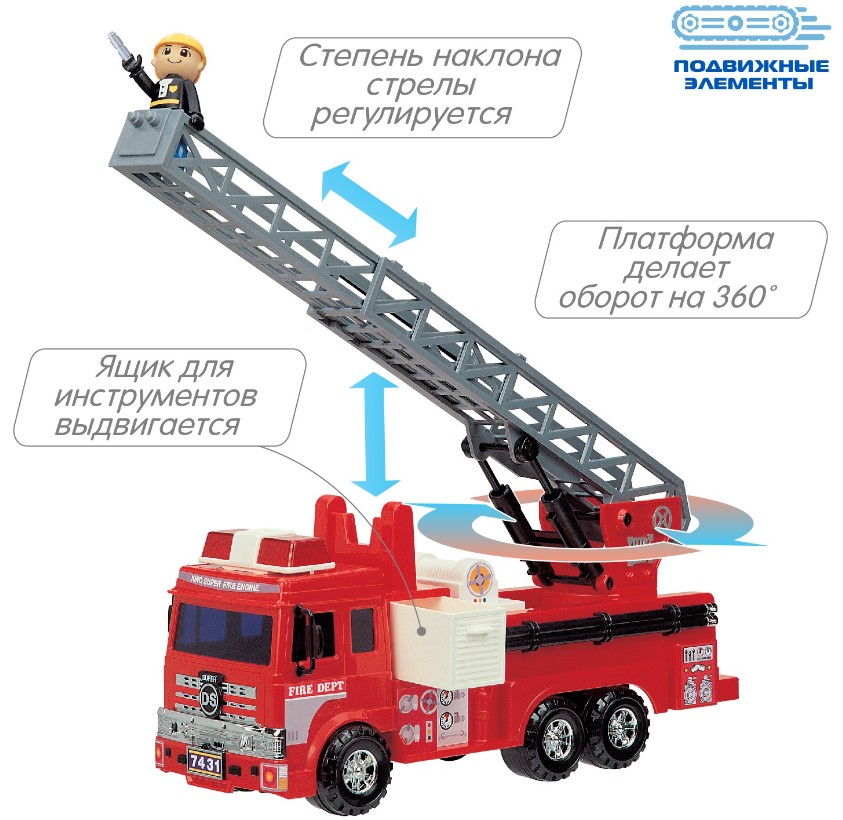 Платформа пожарной машины делает оборот на 360 градусов: поднимите раздвижную лестницу и отрегулируйте степень наклона стрелы. Ребенок сможет сам регулировать положение и длину пожарной лестницы, как это будет задумано по игровому сюжету. Достаньте из ящика для инструментов пожарный шланг и разместите в руке пожарного, чтобы он смог потушить пожар. Внутри машины установлен фрикционный механизм (инерционный механизм разгона): толкните машину вперед, и она поедет, издавая звуки работающего двигателя. Не забудьте отрегулировать зеркала перед началом движения.